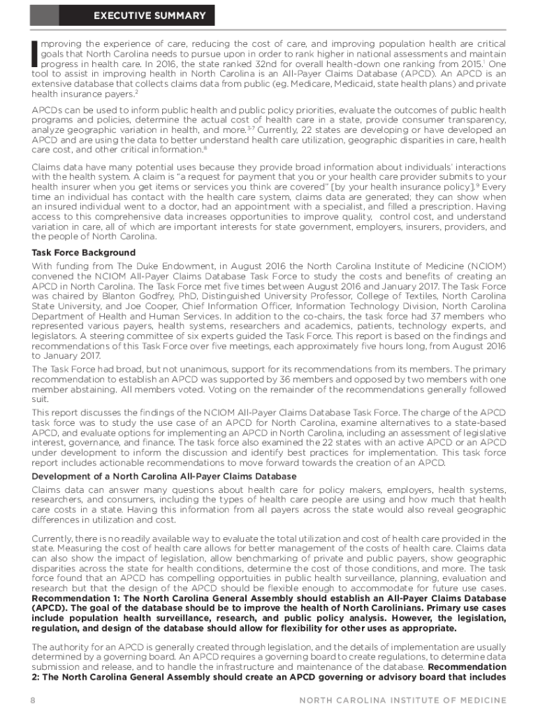 EXECUTIVE SUMMARYImproving the experience of care, reducing the cost of care, and improving population health are critical goals that North Carolina needs to pursue upon in order to rank higher in