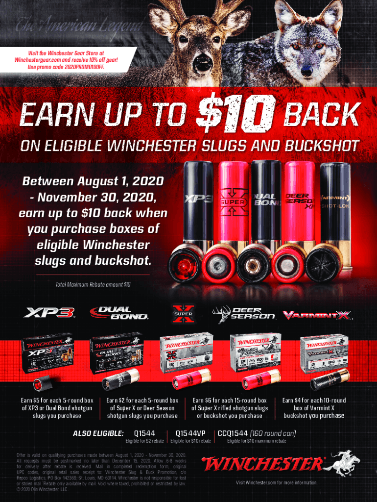 Visit the Winchester Gear Store at Winchestergear.com and receive 10% off gear! Use promo code 2020PROMO10OFF.10 BACKWARD UP TO $ON ELIGIBLE WINCHESTER SLUGS AND BUCKSHOTBetween August 1, 2020, November