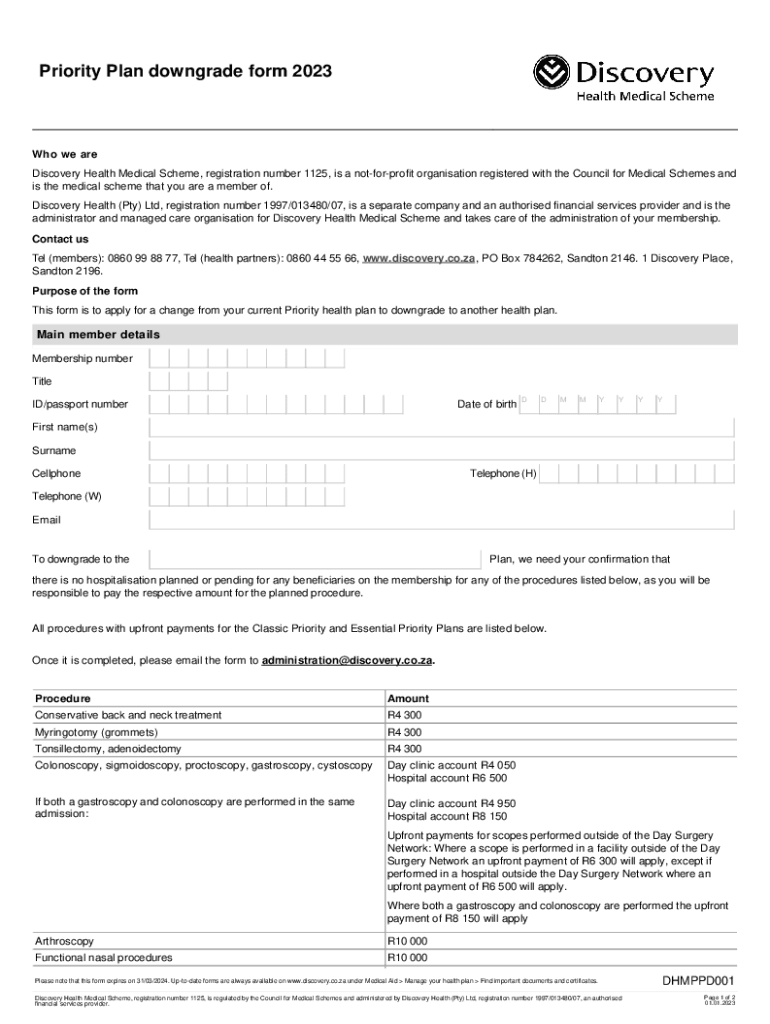 Priority Plan downgrade form 2023Who we are Discovery Health Medical Scheme, registration number 1125, is a notforprofit organization registered with the Council for Medical Schemes and is the medical