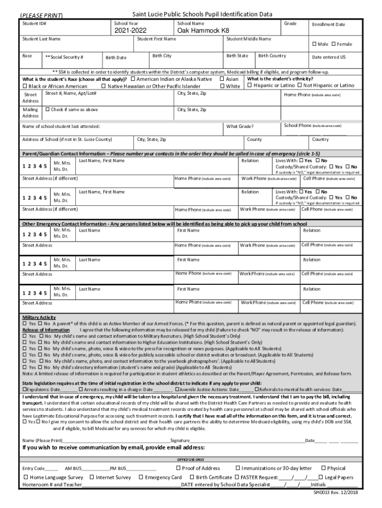 Saint Lucie Public Schools Pupil Identification Data(PLEASE PRINT)