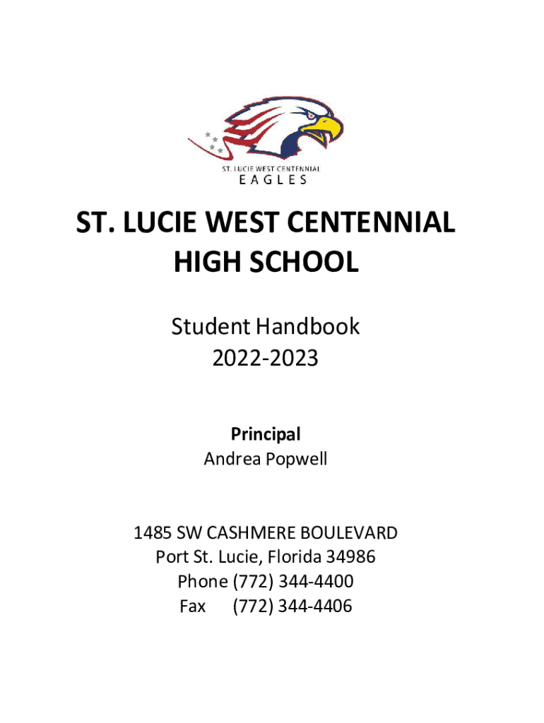 ST. LUCIE WEST CENTENNIAL HIGH SCHOOL Student Handbook 20222023 Principal Andrea Powell 1485 SW CASHMERE BOULEVARD Port St. Lucie, Florida 34986 Phone (772) 3444400 Fax (772) 3444406TABLE OF CONTENTS