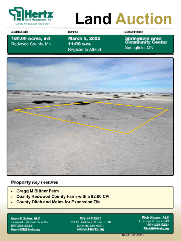 Land Auction ACREAGE:DATE:LOCATION:160.00 Acres, m/l Redwood County, MN March 8, 2022 11:00 a.m. Register to Attend Springfield Area Community Center Springfield, Property Key Features Gregg M Bittner