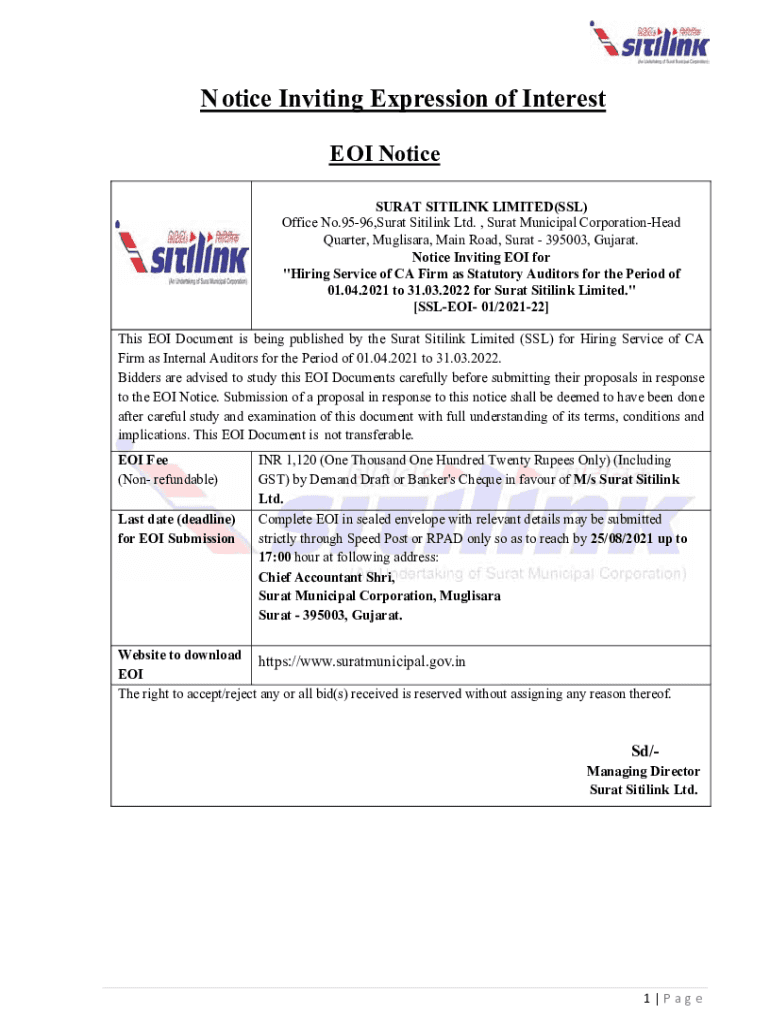 Notice Inviting Expression of Interest E OI Notice SURAT SIMULINK LIMITED(SSL) Office No.9596,Surat Simulink Ltd. , Surat Municipal Corporation Headquarter, Muglisara, Main Road, Surat 395003, Gujarat.