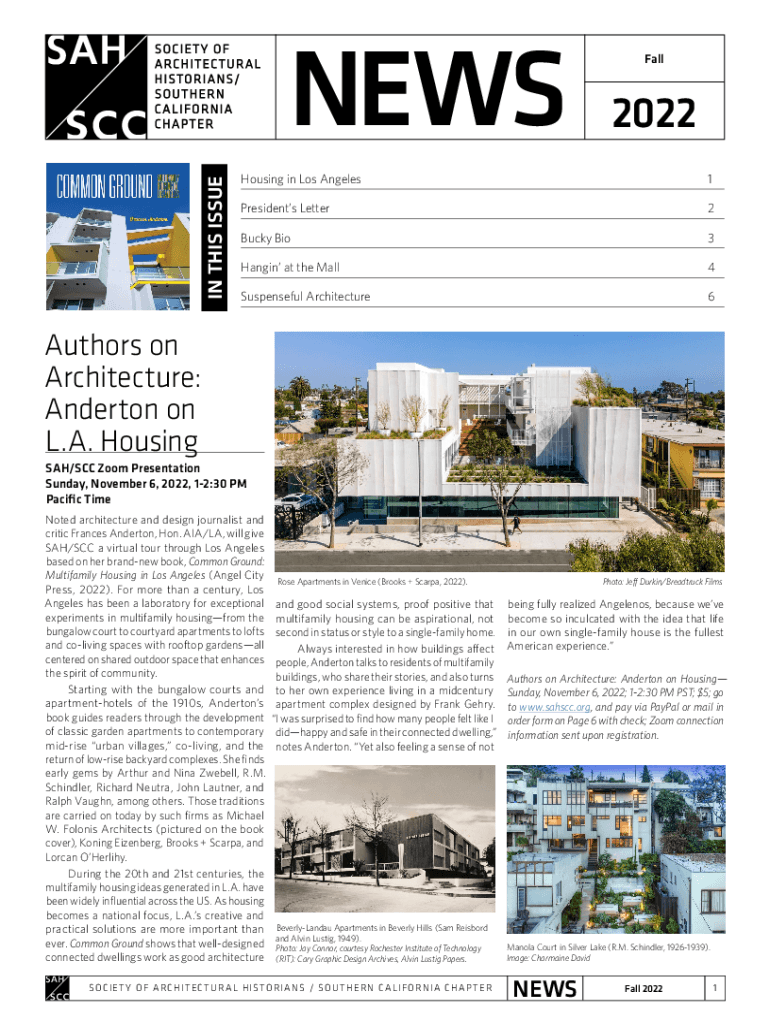 IN THIS ISSUESOCIETY OF ARCHITECTURAL H I S TO R I A N S/ SOUTHERN CALIFORNIA CHAPTERNEWSFall2022Housing in Los Angeles1Presidents Letter2Bucky Bio3Hangin at the Mall4Suspenseful Architecture6Authors