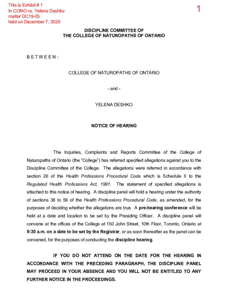 This is Exhibit # 1 In CONE vs. Elena Desk matter DC1905 held on December 7, 20201DISCIPLINE COMMITTEE OF THE COLLEGE OF NATUROPATHS OF ONTARIOBETWEEN: COLLEGE OF NATUROPATHS OF ONTARIO and ELENA