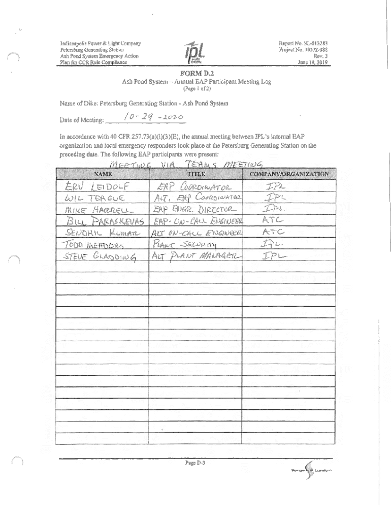 Indianapolis Power & Light Company Petersburg Generating Station Ash Pond System Emergency Action Plan for CCR Rule ComplianceReport No. SL013283 Project No. 10572088 Rev. 3 We 19, 2019FORM D.2 Ash