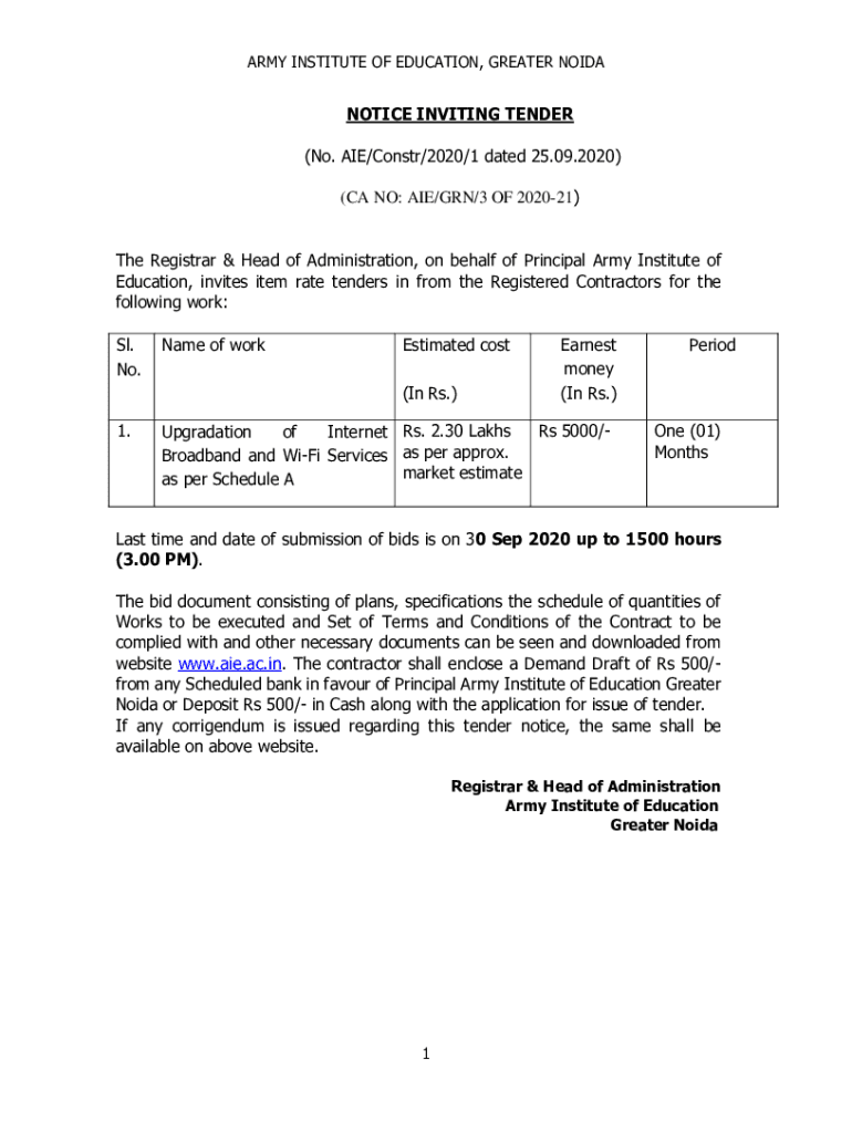 Get the free NOTICE INVITING TENDER (No. AIE/Constr/2020/1 dated ... - aie ac