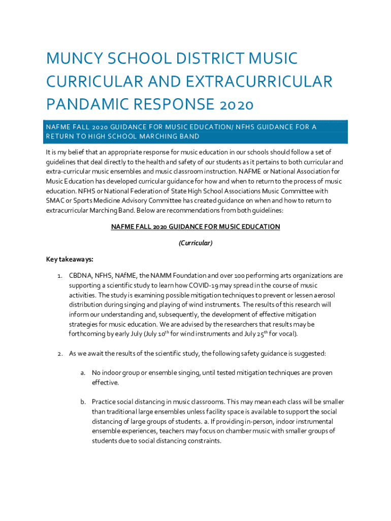 MUNCH SCHOOL DISTRICT MUSIC CURRICULAR AND EXTRACURRICULAR PANDEMIC RESPONSE 2020 NAME FALL 2020 GUIDANCE FOR MUSIC EDUCATION/ NFHS GUIDANCE FOR A RETURN TO HIGH SCHOOL MARCHING BAND It is my belief