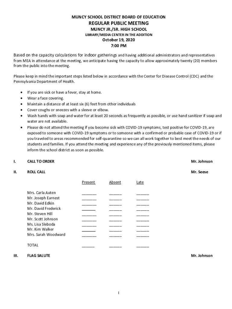 MUNCH SCHOOL DISTRICT BOARD OF EDUCATIONREGULAR PUBLIC MEETING MUNCH JR./SR. HIGH SCHOOLLIBRARY/MEDIA CENTER IN THE ADDITION October 19, 2020 7:00 Based on the capacity calculations for indoor gatherings
