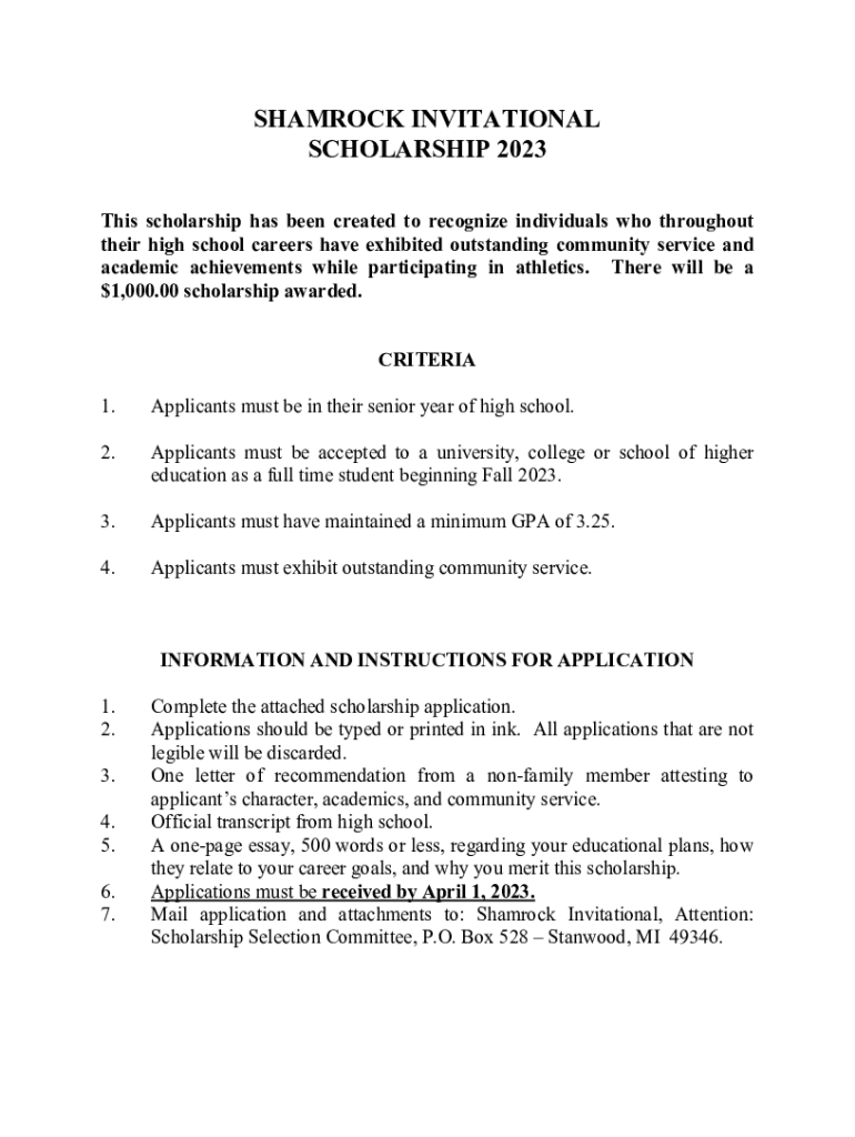 SHAMROCK INVITATIONAL SCHOLARSHIP 2023 This scholarship has been created to recognize individuals who throughout their high school careers have exhibited outstanding community service and academic