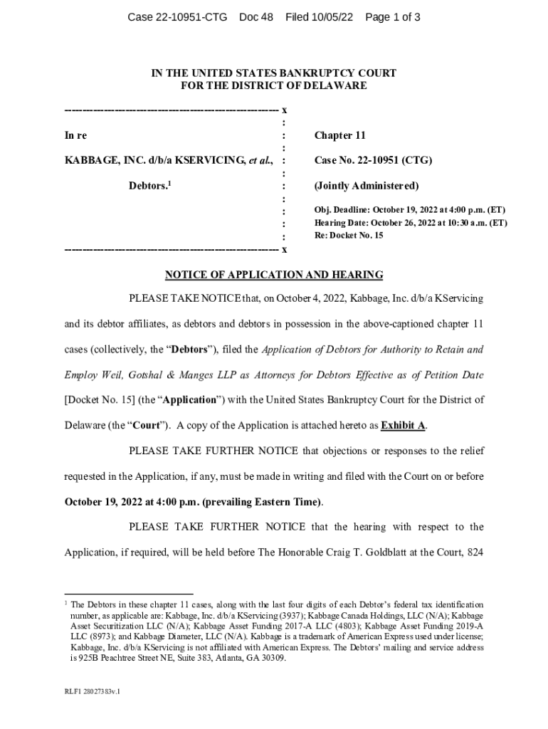 Case 2210951CTGDoc 48Filed 10/05/22Page 1 of 3IN THE UNITED STATES BANKRUPTCY COURT FOR THE DISTRICT OF DELAWARE x : In re : : CABBAGE, INC. d/b/a SERVICING, et al., : : 1 Debtors. : : : : : chapter
