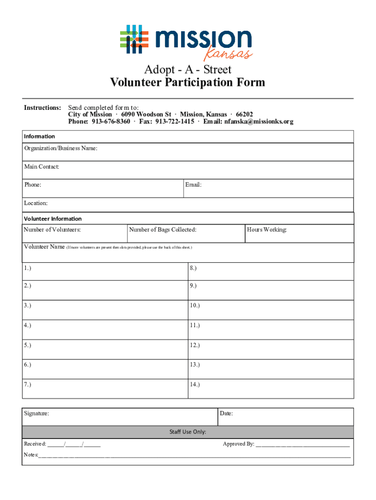 Adopt A Street Volunteer Participation Form Instructions:Send completed for m to: City of Mission 6090 Woodson St Mission, Kansas 66202 Phone: 9136768360 Fax: 9137221415 Email: nfanska@missionks.orgInformation