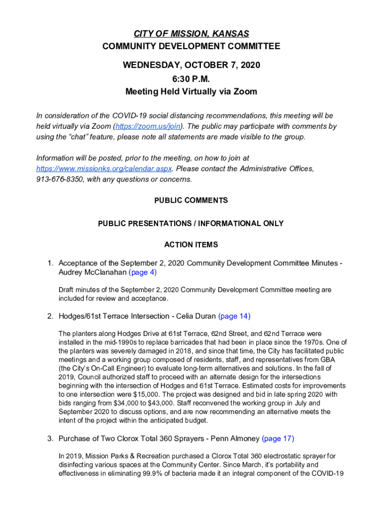 CITY OF MISSION, KANSAS COMMUNITY DEVELOPMENT COMMITTEE WEDNESDAY, OCTOBER 7, 2020 6:30 P.M. Meeting Held Virtually via Zoom In consideration of the COVID-19 social distancing recommendations, this