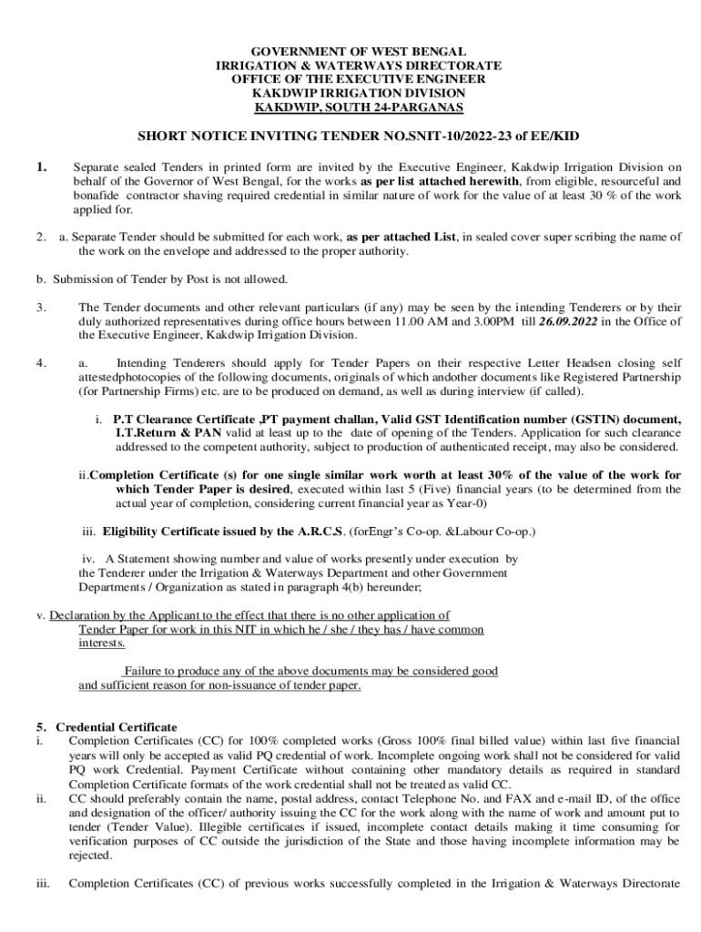 GOVERNMENT OF WEST BENGAL IRRIGATION & WATERWAYS DIRECTORATE OFFICE OF THE EXECUTIVE ENGINEER BALDWIN IRRIGATION DIVISION BALDWIN, SOUTH 24PARGANASSHORT NOTICE INVITING TENDER NO.SNIT10/202223 of
