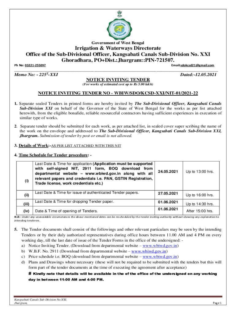 Get the free NOTICE INVITING TENDER NO - WBIW/SDO/KCSD-XXI/NIT ... - wbiwd gov