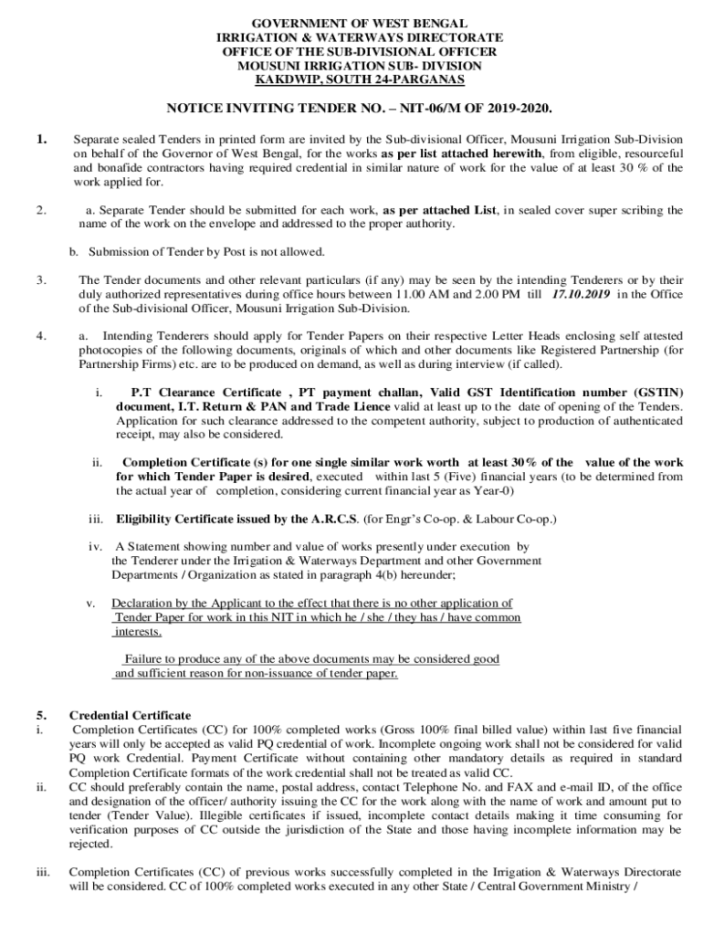 Get the free NOTICE INVITING TENDER NO - wbiwd gov