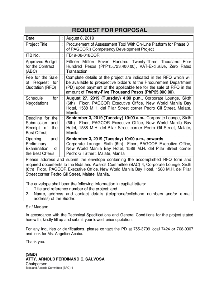 REQUEST FOR PROPOSAL Date Project Title: August 8, 2019 : Procurement of Assessment Tool With Online Platform for Phase 3 of Pastors Competency Development Project ITB No. FB1908018COR Approved Budget