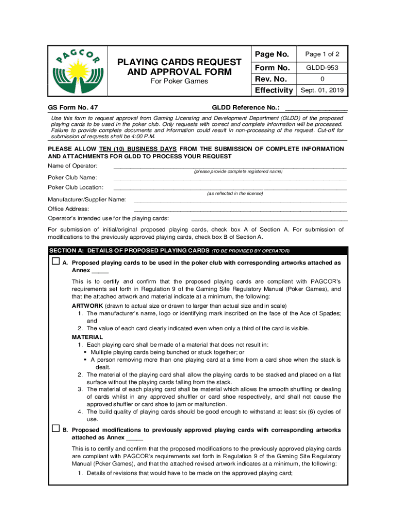 Page No. PLAYING CARDS REQUEST AND APPROVAL FORM For Poker Games Form No. 47Page 1 of 2GLDD953 Form No. 0 Rev. No. Effectivity Sept. 01, 2019GLDD Reference No.: ___Use this form to request approval