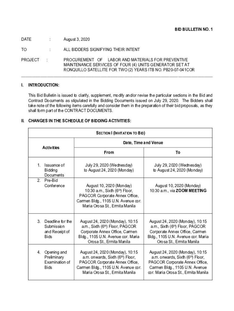 BID BULLETIN NO. 1 DATE:August 3, 2020TO:ALL BIDDERS SIGNIFYING THEIR INTENTPROJECTPROCUREMENT OF LABOR AND MATERIALS FOR PREVENTIVE MAINTENANCE SERVICES OF FOUR (4) UNITS GENERATOR SET AT TRANQUILLY