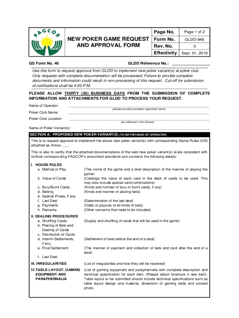 Page No. Page 1 of 2NEW POKER GAME REQUEST Form No. AND APPROVAL FORM Rev. No.GLDD946 0Effectivity Sept. 01, 2019 GS Form No. 40GLDD Reference No.: ___Use this form to request approval from GLAD to