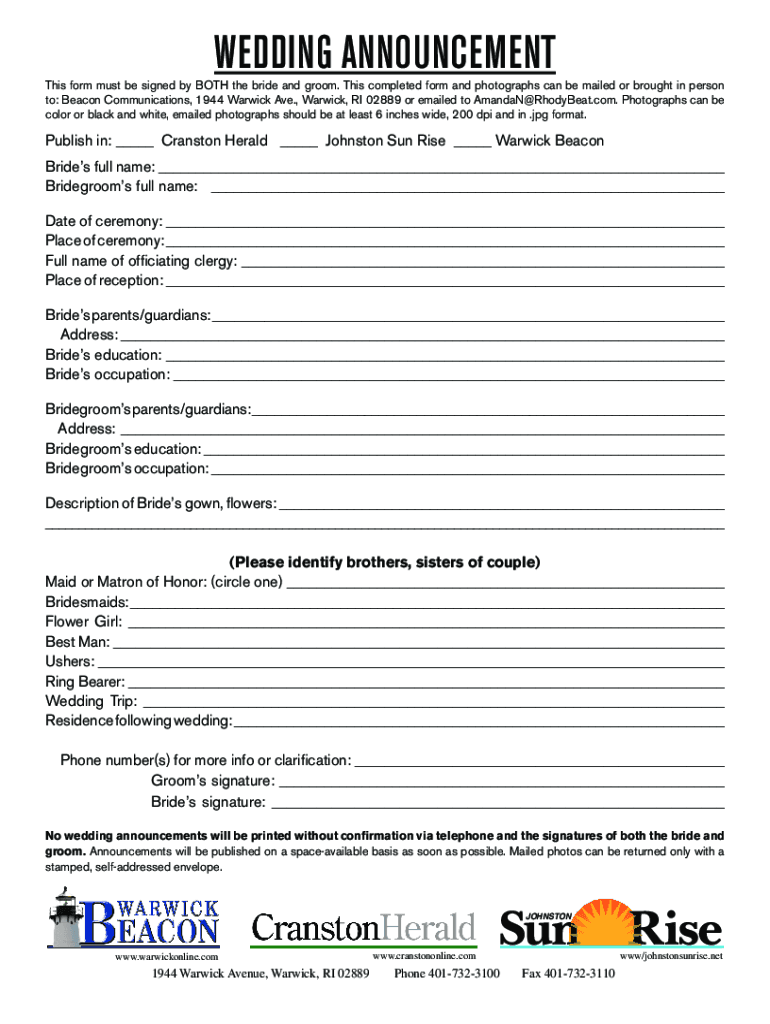 WEDDING Announcements form must be signed by BOTH the bride and groom. This completed form and photographs can be mailed or brought in person