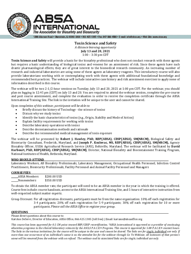Toxin Science and Safety A distance learning opportunity July 13 and 20, 2021 1:00 3:30 pm Cotton Science and Safety will provide a basis for the biosafety professional who does not conduct research