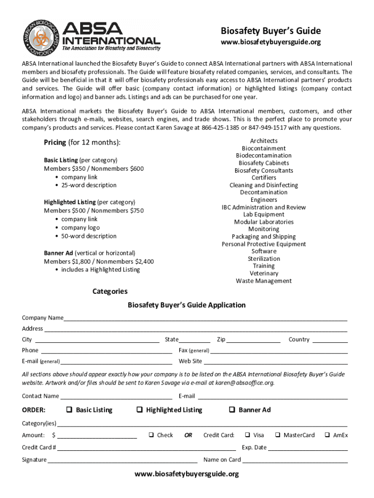 BiosafetyBuyersGuide www.biosafetybuyersguide.org ABSAInternationallaunchedtheBiosafetyBuyersGuidetoconnectABSAInternationalpartnerswithABSAInternational membersandbiosafetyprofessionals. TheGuidewillfeaturebiosafetyrelatedcompanies,