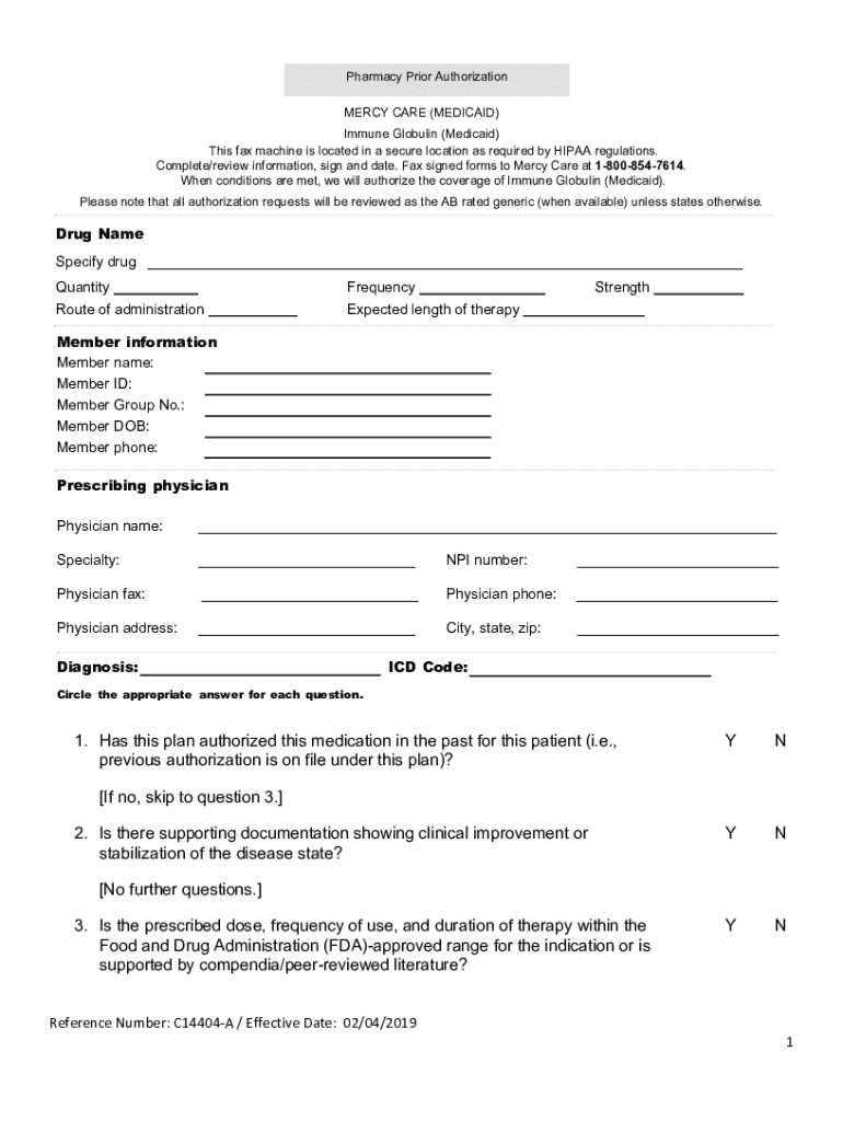 Pharmacy Prior Authorization MERCY CARE (MEDICAID) Immune Globulin (Medicaid) This fax machine is located in a secure location as required by HIPAA regulations. Complete/review information, sign and