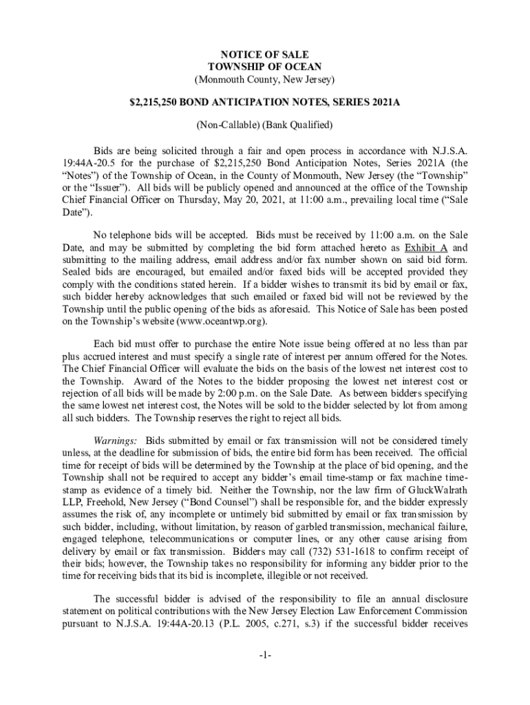 NOTICE OF SALE TOWNSHIP OF OCEAN (Monmouth County, New Jersey) $2,215,250 BOND ANTICIPATION NOTES, SERIES 2021A (Conceivable) (Bank Qualified) Bids are being solicited through a fair and open process