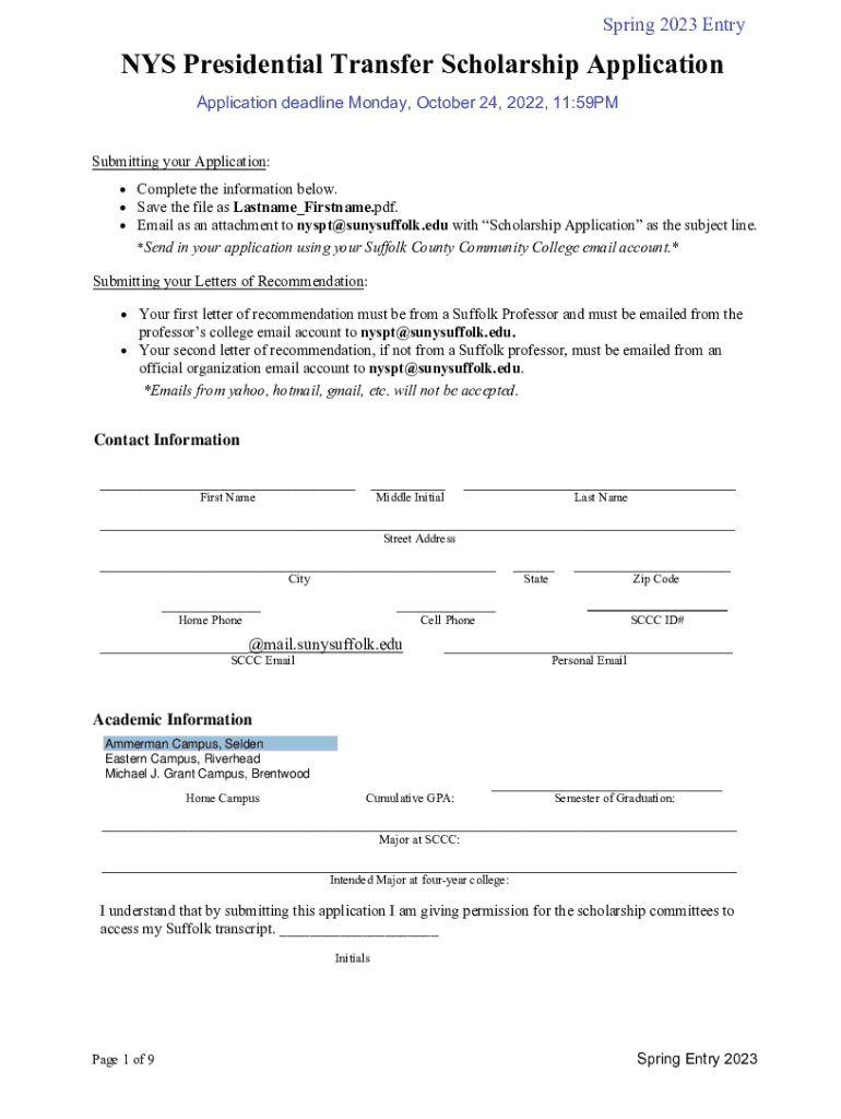 Spring 2023 Entrants Presidential Transfer Scholarship Application deadline Monday, October 24, 2022, 11:59PM Submitting your Application: Complete the information below. Save the file as Last name_Firstname.pdf.