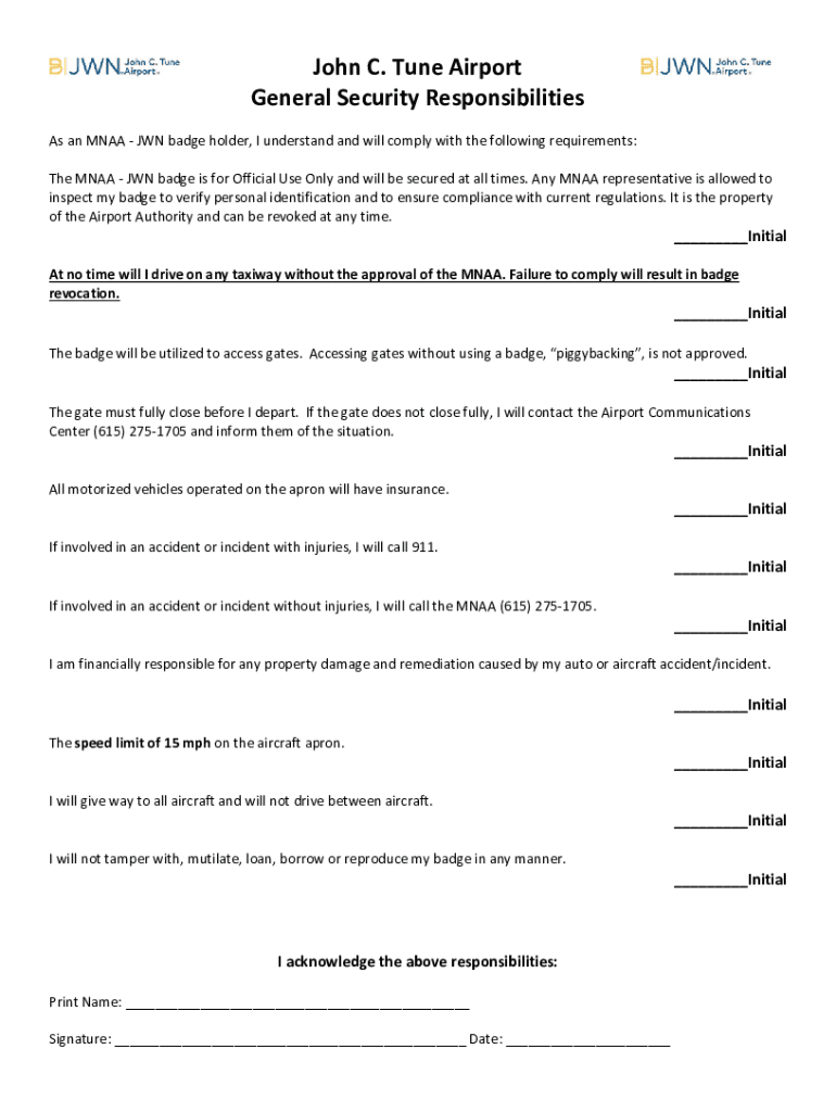 John. TuneAirport GeneralSecurityResponsibilities. AsanMNAAJWNbadgeholder, Iunderstandandwillcomplywiththefollowingrequirements: TheMNAAJWNbadgeisforOfficialUseOnlyandwillbesecuredatalltimes. AnyMNAArepresentativeisallowedto