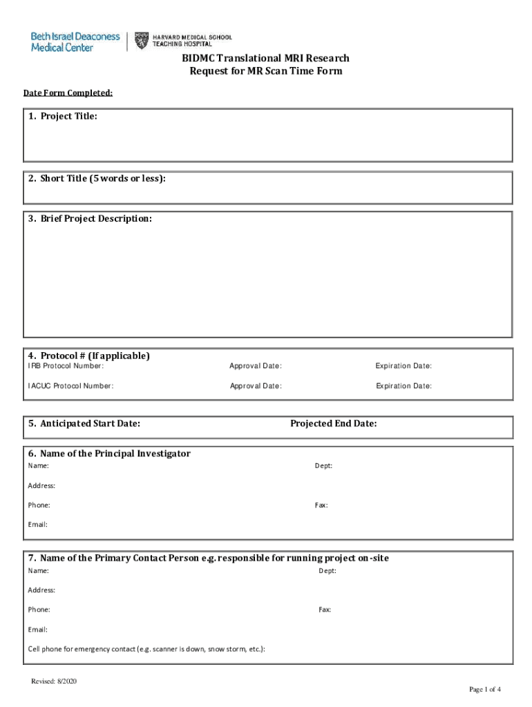 BI DMC Translational MRI Research Request for MR Scan Time Form Date Form Completed:1. Project Title:2. Short Title (5 words or fewer):3. Brief Project Description:4. Protocol # (If applicable) IRB