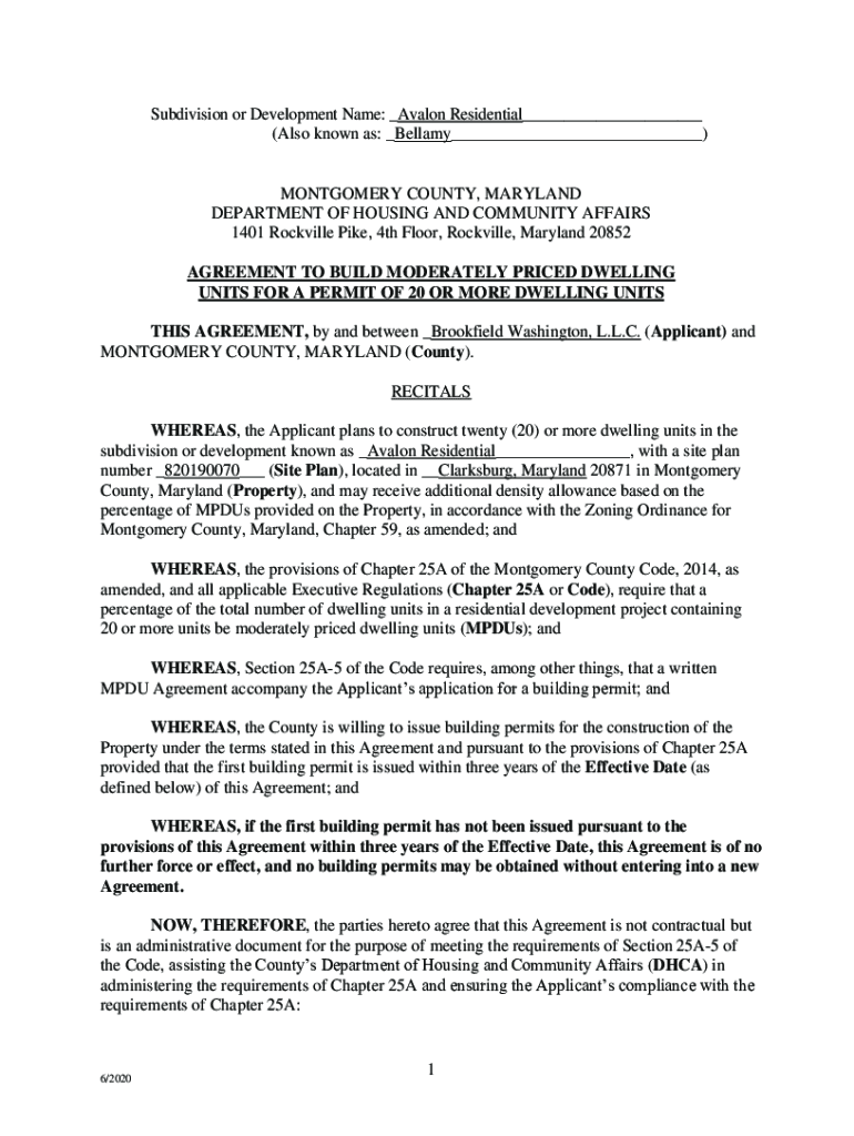Subdivision or Development Name: _Avalon Residential___ (Also known as: _Bellamy___)MONTGOMERY COUNTY, MARYLAND DEPARTMENT OF HOUSING AND COMMUNITY AFFAIRS 1401 Rockville Pike, 4th Floor, Rockville,