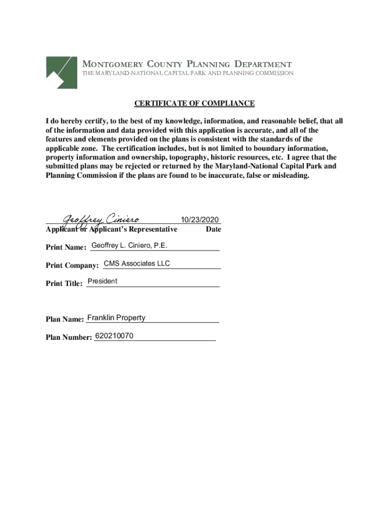MONTGOMERY COUNTY PLANNING DEPARTMENT MARYLANDNATIONAL CAPITAL PARK AND PLANNING COMMISSIONCERTIFICATE OF COMPLIANCE I do hereby certify, to the best of my knowledge, information, and reasonable belief,