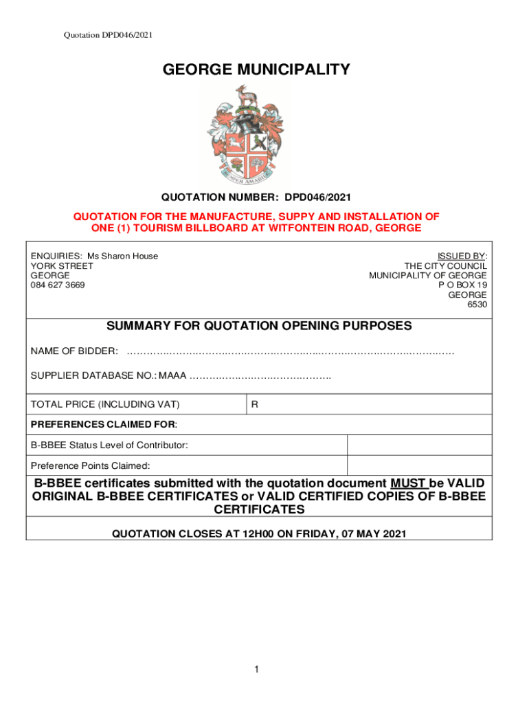 Quotation DPD046/2021GEORGE MUNICIPALITYQUOTATION NUMBER: DPD046/2021 QUOTATION FOR THE MANUFACTURE, SUPPLY AND INSTALLATION OF ONE (1) TOURISM BILLBOARD AT WITFONTEIN ROAD, GEORGE Inquiries: Ms Sharon