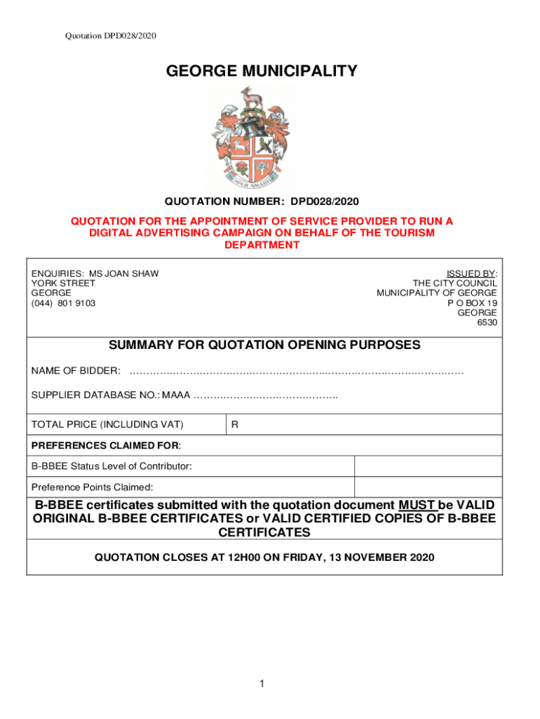 Quotation DPD028/2020GEORGE MUNICIPALITYQUOTATION NUMBER: DPD028/2020 QUOTATION FOR THE APPOINTMENT OF SERVICE PROVIDER TO RUN A DIGITAL ADVERTISING CAMPAIGN ON BEHALF OF THE TOURISM DEPARTMENT Inquiries: