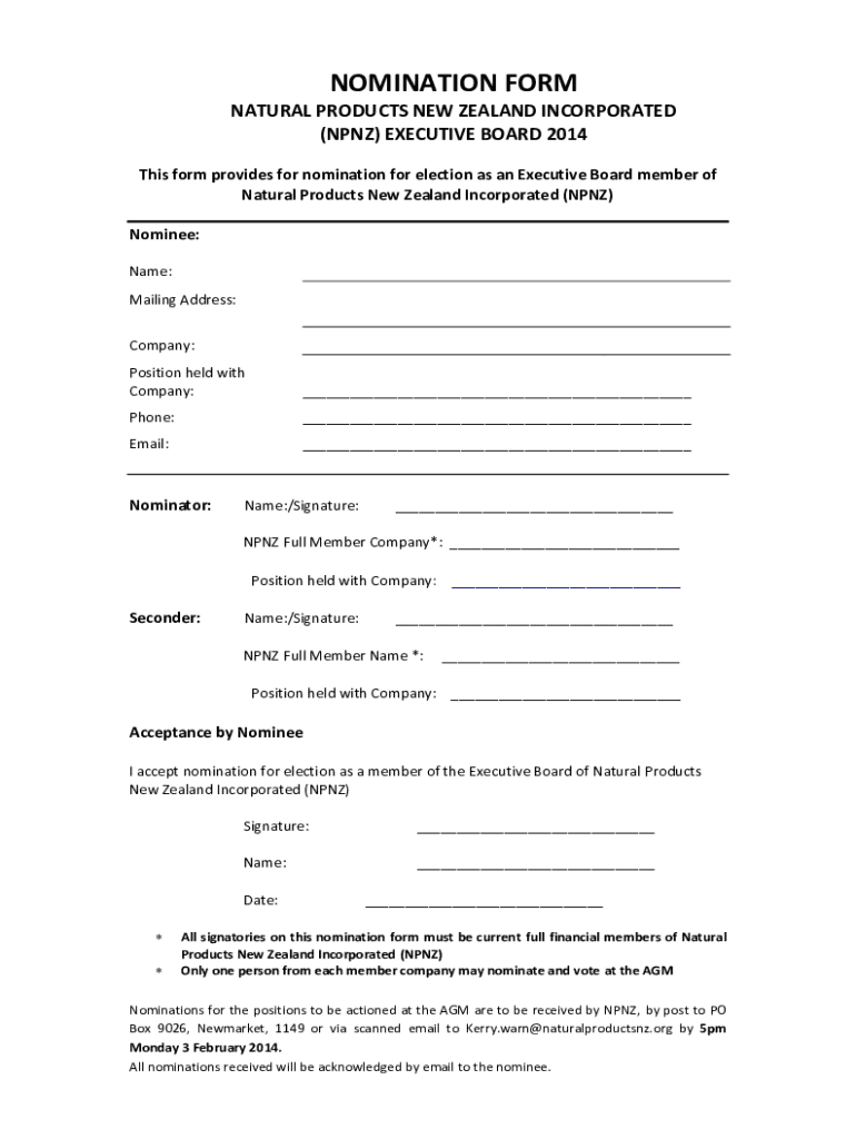 NOMINATION FORM NATURAL PRODUCTS NEW ZEALAND INCORPORATED (NPNS) EXECUTIVE BOARD 2014 This form provides for nomination for election as an Executive Board member of Natural Products New Zealand Incorporated