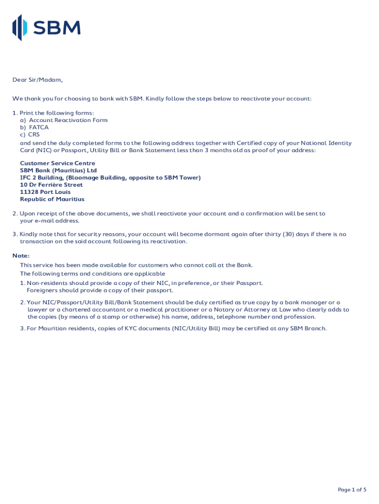 Dear Sir/Madam, We thank you for choosing to bank with SBM. Kindly follow the steps below to reactivate your account: 1. Print the following forms: a) Account Reactivation Form b) FATWA c) CRS and