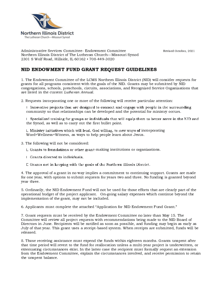 Administrative Services Committee Endowment Committee Northern Illinois District of The Lutheran Church Missouri Synod 2301 S Wolf Road, Hillside, IL 60162 7084493020Revised October, 2021NID ENDOWMENT