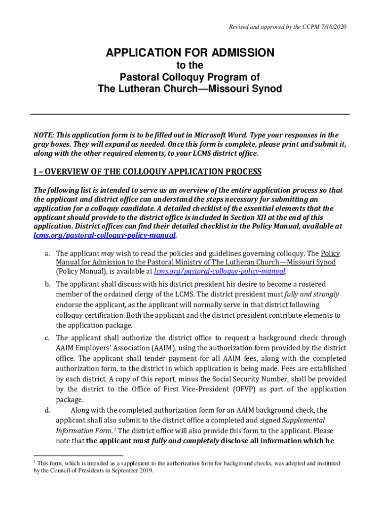 Revised and approved by the CCP 7/16/2020APPLICATION FOR ADMISSION to the Pastoral Colloquy Program of The Lutheran Church Missouri Syndrome: This application form is to be filled out in Microsoft