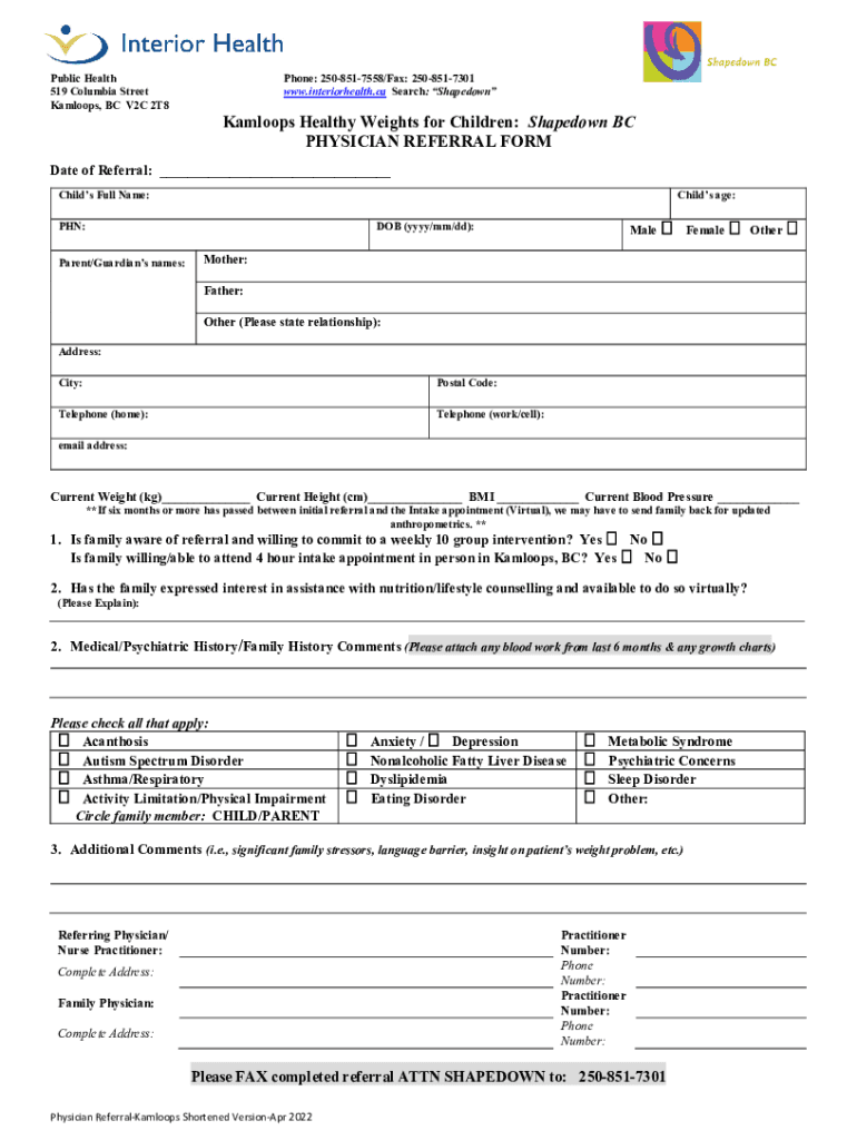Public Health 519 Columbia Street Balloons, BC V2C 2T8Phone: 2508517558/Fax: 2508517301 www.interiorhealth.ca Search: ShapedownKamloops Healthy Weights for Children: Shakedown BC PHYSICIAN REFERRAL