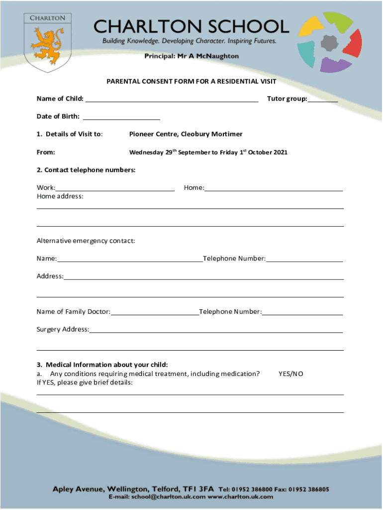 PARENTAL CONSENT FORM FOR A RESIDENTIAL VISIT Name of Child: ___Tutor group:___Date of Birth: ___ 1. Details of Visit to:Pioneer Center, Cleo bury MortimerFrom:Wednesday 29th September to Friday 1st