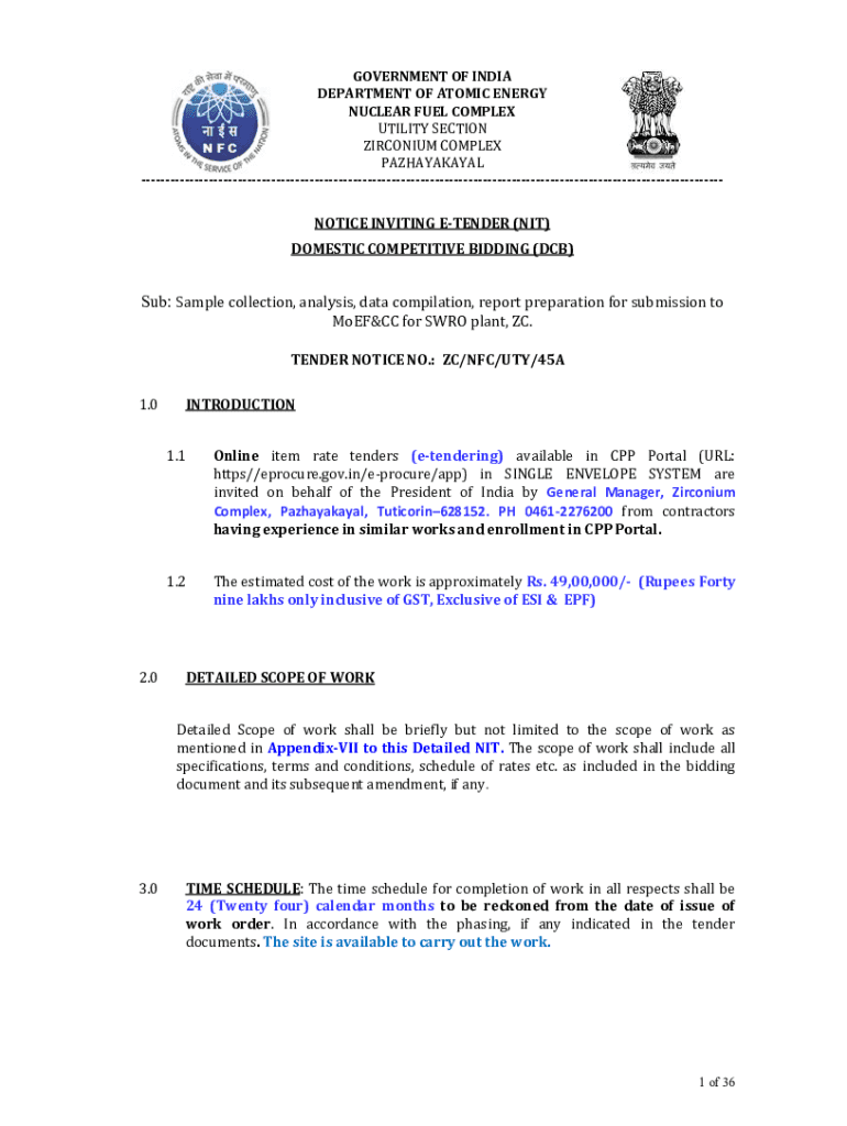 GOVERNMENT OF INDIA DEPARTMENT OF ATOMIC ENERGY NUCLEAR FUEL COMPLEX UTILITY SECTION ZIRCONIUM COMPLEX PAZHAYAKAYAL NOTICE INVITING TENDER (NIT) DOMESTIC COMPETITIVE BIDDING (DCB)Sub: Sample collection,