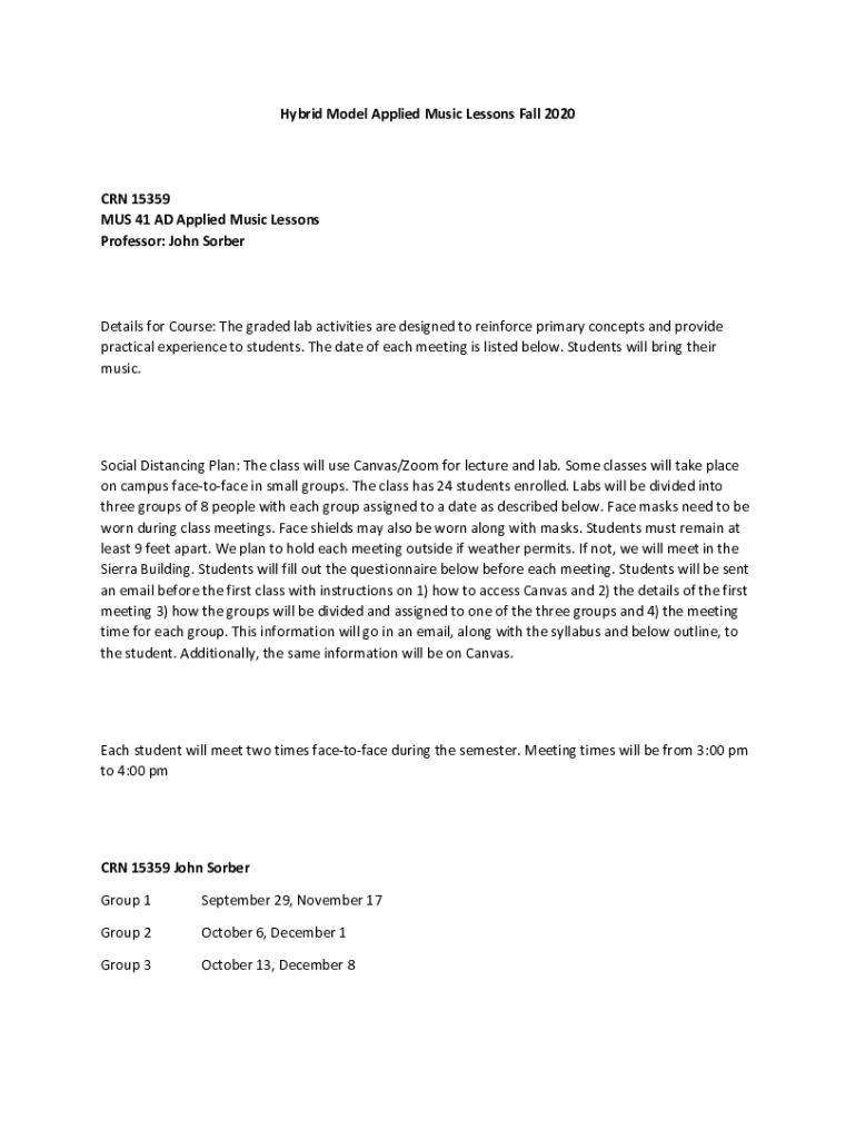 Hybrid Model Applied Music Lessons Fall 2020CRN 15359 MUS 41 AD Applied Music Lessons Professor: John SorberDetails for Course: The graded lab activities are designed to reinforce primary concepts