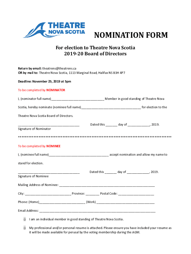 NOMINATION FORM For election to Theater Nova Scotia 201920 Board of Directors Return by email: theatrens@theatrens.ca OR by mail to: Theater Nova Scotia, 1113 Marginal Road, Halifax NS B3H 4P7 Deadline: