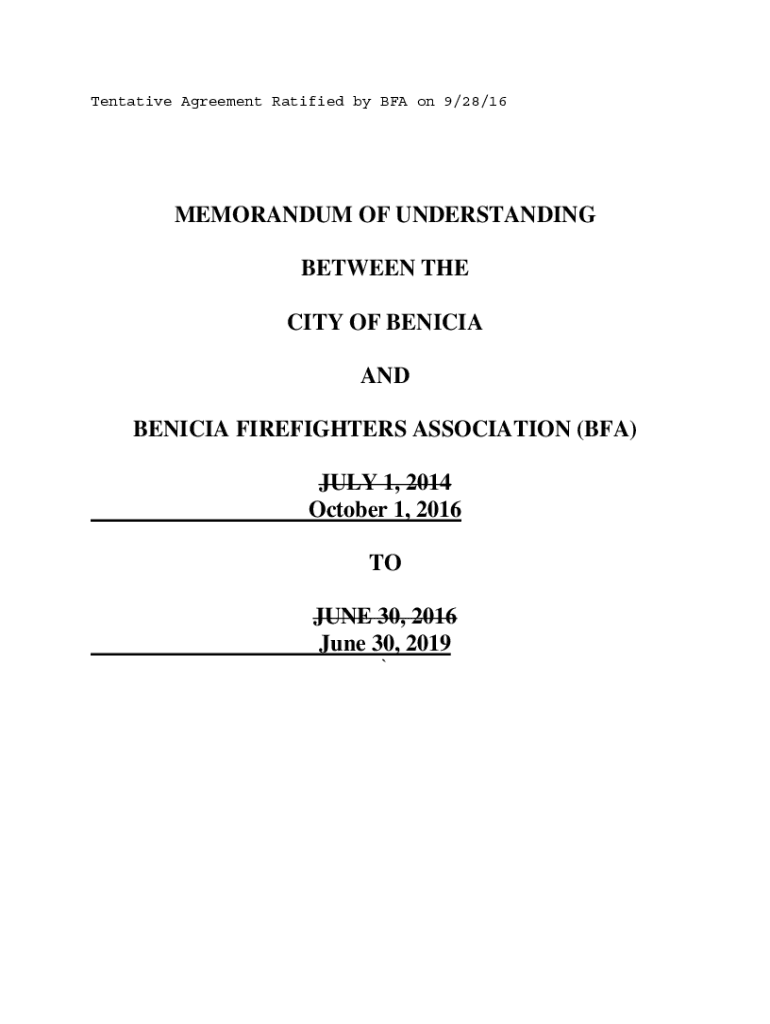 Tentative Agreement Ratified by BFA on 9/28/16MEMORANDUM OF UNDERSTANDING BETWEEN THE CITY OF BENICIA AND BENICIA FIREFIGHTERS ASSOCIATION (BFA) JULY 1, 2014, October 1, 2016, TO JUNE 30, 2016, June