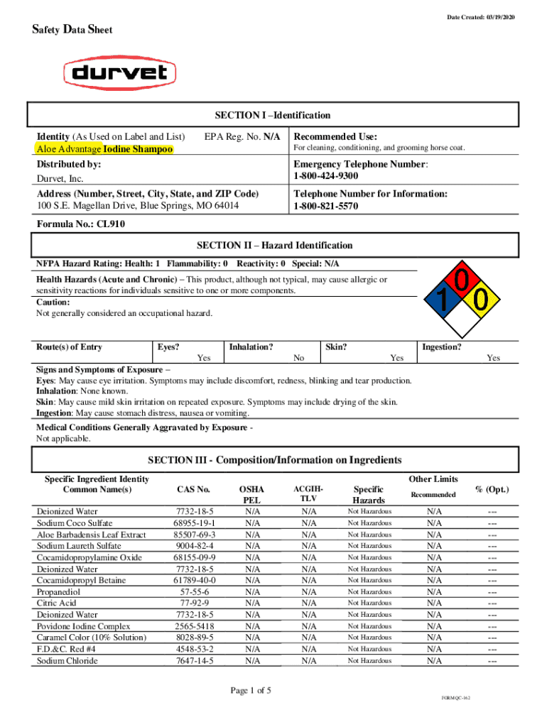 Date Created: 03/19/2020Safety Data SheetSECTION I Identification