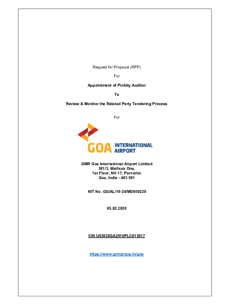 Request for Proposal (RFP) For Appointment of Probity Auditor To Review & Monitor the Related Party Tendering Process Forger Goa International Airport Limited 381/3, Mature One, 1st Floor, NH 17,