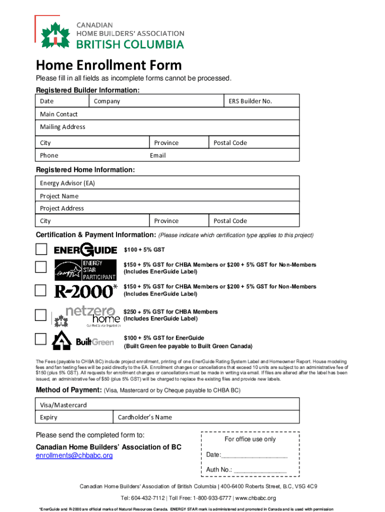 Home Enrollment Form Please fill in all fields as incomplete forms cannot be processed. Registered Builder Information: DateCompanyERS Builder No. Main Contact Mailing Address CityProvincePhonePostal