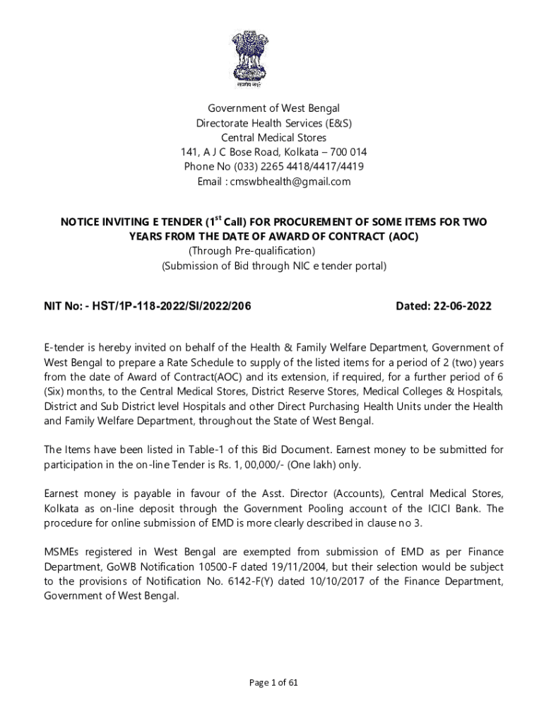 Government of West Bengal Directorate Health Services (E&S) Central Medical Stores 141, A J C Bose Road, Kolkata 700 014 Phone No (033) 2265 4418/4417/4419 Email : cmswbhealth@gmail.com NOTICE INVITING